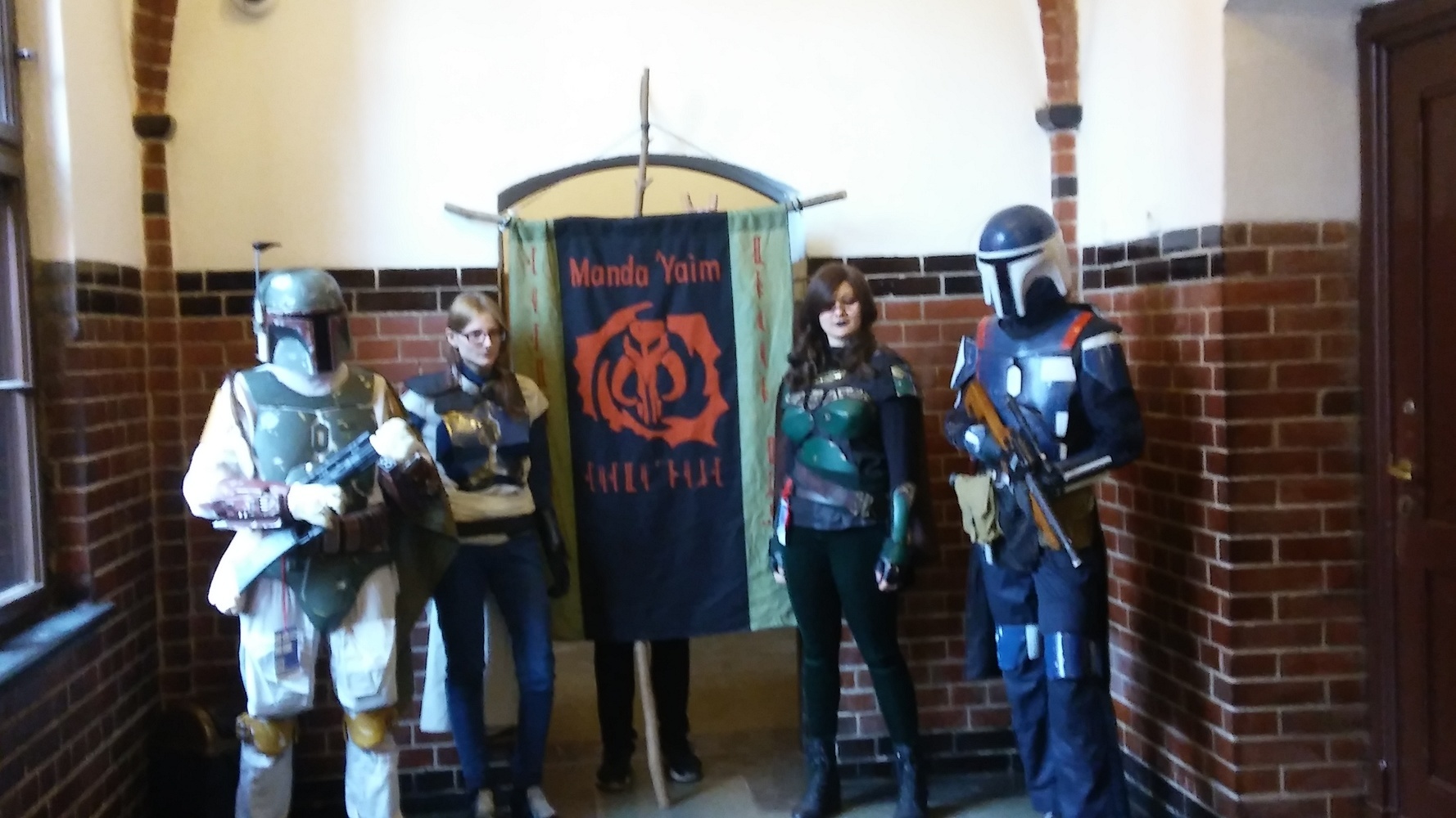 Moja perspektywa różniła się nieco od perspektywy innych Mandalorian - toruńskie Collegium Maius nie jest dla mnie zwykłym konwentowym budynkiem, ale przede wszystkim odwiedzanym prawie codziennie wydziałem uczelni. Patrząc na rozkładanie obozu, jak na zawałaszczenie ("podbój") przestrzeni, w której regularnie mam zajęcia, przepełniał mnie wewnętrzną satysfakcją. Szalenie podobało mi się jak dobrze mandaloriańskie wystawki, jak i swego rodzaju wernisaż prac naszego Mand`alora, które zajęły spory kawałek korytarza, prezentowały się w gotyckim wnętrzu Maiusa. I choć liczba gości, którzy mogliby podziwiać ten widok nie była znaczna, uważam, że nasz "podbój" zakończył się chwalebnym sukcesem.